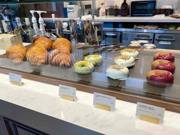 午前中にうかがったところ、大きなクロワッサンとカラフルなドーナツが並んでいました!