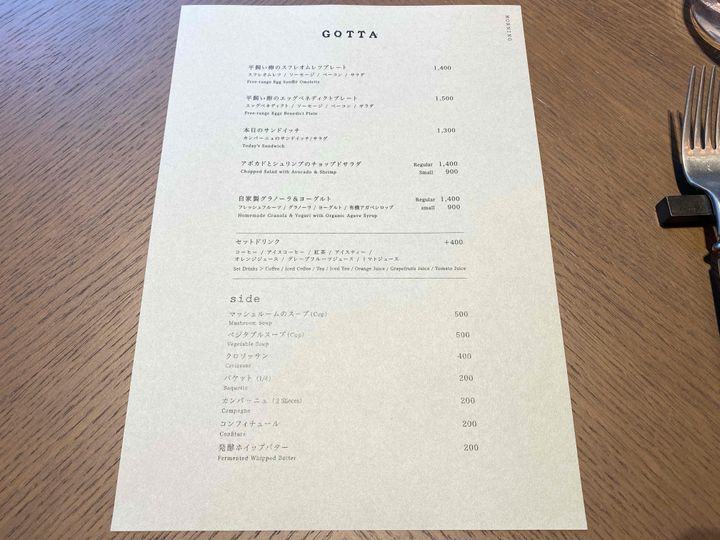 GOTTAのモーニングの提供時間はオープン時間の8時から午前11時まで。一般的に旨みとコクが強いとされる平飼い卵を使用したエッグベネディクトやスフレオムレツなどの卵料理を中心とし、本日のサンドウィッチなども用意されていました。