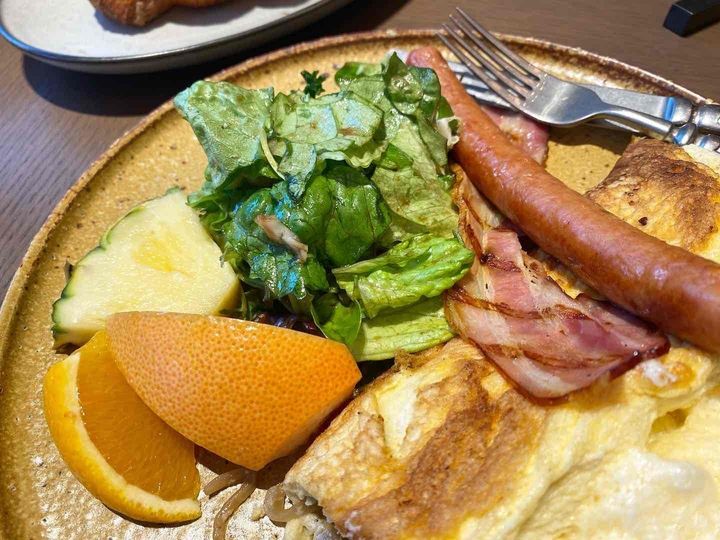 私がいただいた「平飼い卵のスフレオムレツプレート」は、驚きのボリューム。サラダとフルーツ、ソーセージとベーコンがセットになっていてお得感がありました。プレートの彩りも美しくて、垢抜け巻抜群のこの空間とマッチしています。