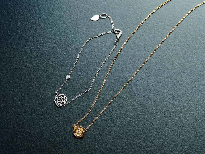 ブレスレット(左):2020年10月に、ピアジェ 銀座本店で約16万円で購入ペンダント(右):2022年12月に、ピアジェ 銀座本店で約30万円で購入ブレスレットのバラのモチーフは平面に、ペンダントは立体的になっている。それぞれブリリアントカットダイヤモンドがセットされ「控えめな主張ながら、知性を感じるデザインがお気に入りです」