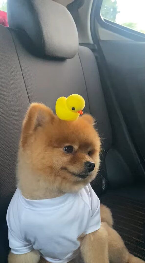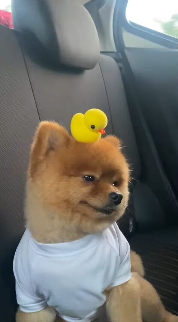 座席にお行儀よく座っている子犬ですが、その頭にはアヒルのオモチャがちょこんと乗っています。