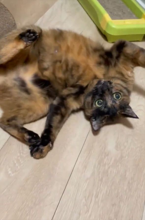 床に寝転がって毛づくろいしていたところを飼い主さんがチョンっと指で突つくと、こんなリアクションを見せてくれました。 とても驚いたみたいです。