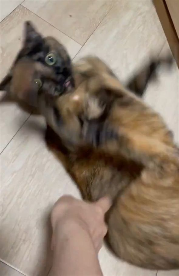寝転がっている愛猫を指でつついた飼い主さん。 すると、猫はアクロバットなリアクションをしてみせました!!