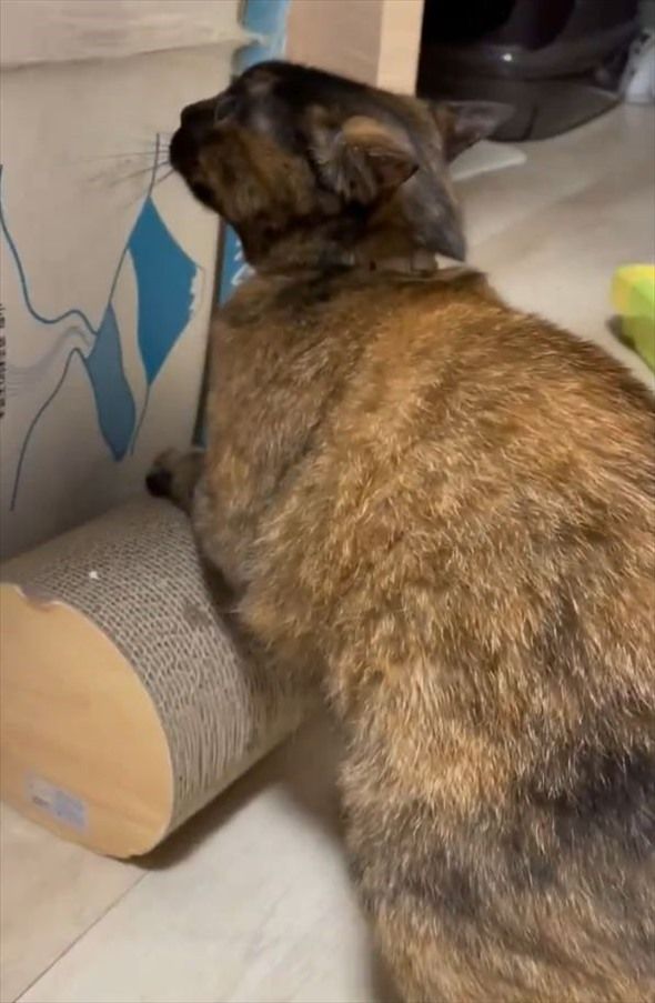 ご紹介するのは、しゃーぽ(@syapoyade)さんがXに投稿された動画です。 愛猫のサビ猫『しゃけ』(通称:しゃーぽ)ちゃんのあるリアクションを捉えた映像です。
