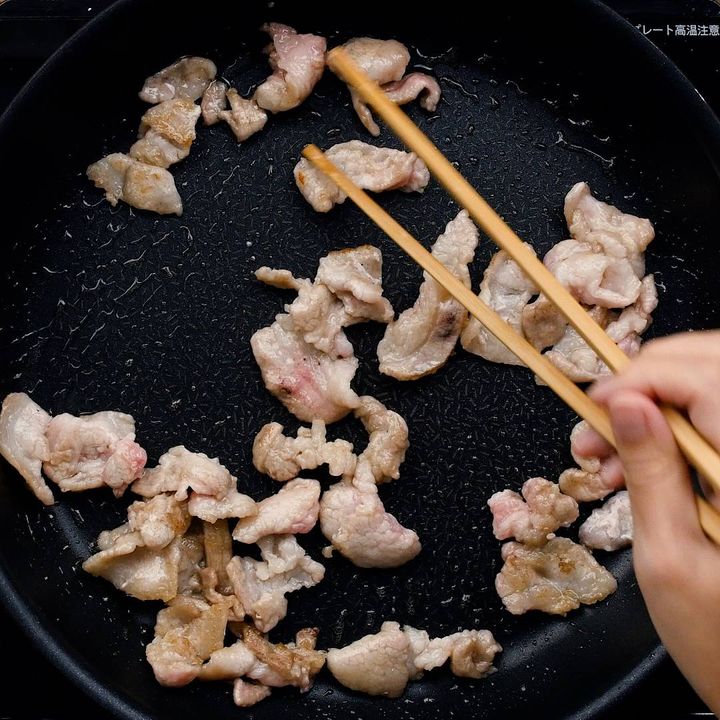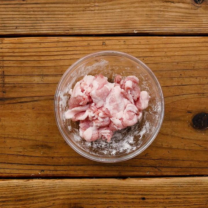 豚肉には片栗粉をまぶすことで調味料とからみやすくなります。