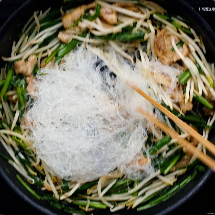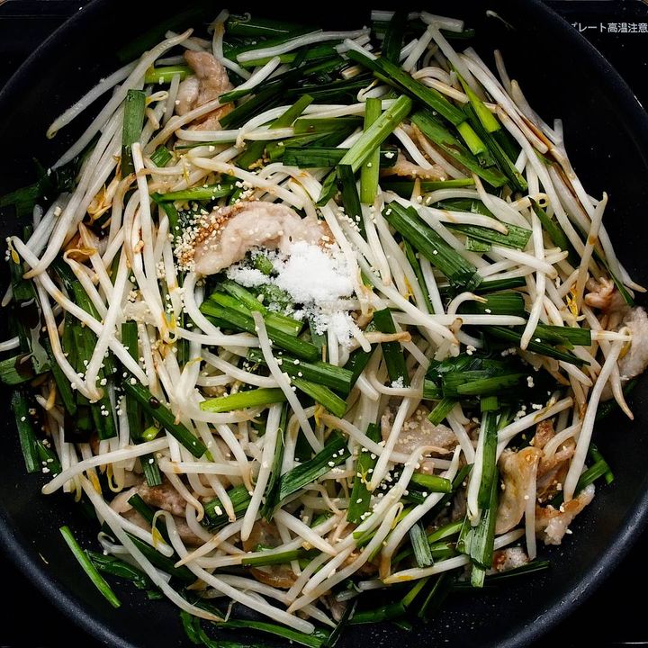 ニラともやしは水分が出やすいので、さっと炒めてください。