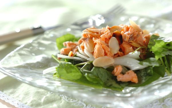 ペスカタリアンで使用できる魚・野菜・ナッツを使ったサラダは、短時間で作ったとは思えない美味しさ。塩鮭はレンジ加熱するため、グリルがない方にもおすすめです。鮭をほぐして甘酢の漬けるひと手間でドレッシング代わりになりますよ。ベビーリーフや水菜などでアレンジしてもOK。