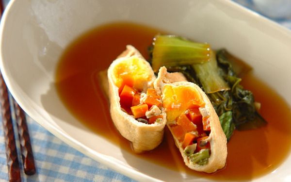 ベジタリアンレシピに重宝する和食材。こちらのレシピでは油揚げを活用します。袋状に開き、卵や野菜を入れてコトコト煮るとジュワッとだしがしみた主菜の完成です。油揚げに詰める野菜は好みで良く、風味の良いゴボウを入れるのもおすすめ。だし汁は昆布としいたけでとったものが良いですね。