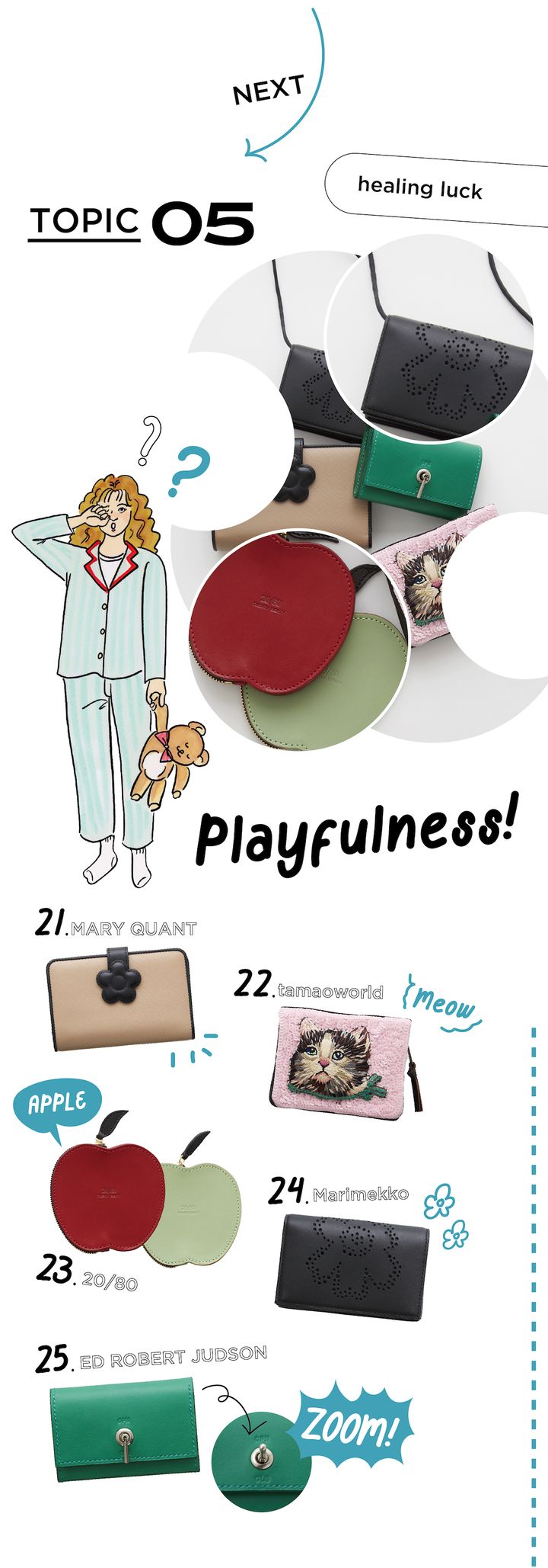 2023年、一生懸命になりすぎてちょっと疲れちゃったかも…なんて人は、バッグの中から取り出す度にふふふっと笑顔になれるようなアソビゴコロ溢れるお財布を相棒にしてみない?キュートなお花や果物がモチーフだったり、にゃんとも可愛い猫が刺繍されていたり…はたまた、留め具にさりげないユーモアを忍ばせたさりげないアソビゴコロにキュンとして。二つ折り財布にコインケース、カードケースだっていい。自分にとっていちばん心地よいものを探してみて。