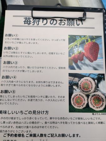 予約時間前にビニールハウス内で申込書に記名して、注意書きをよく確認します。料金をお支払いしたら、いちごを入れる容器とハサミを受け取ります。手でひっぱって取ると傷んでしまうので、ハサミで切って詰むことがポイント。また、練乳も持込み可なのでお好みで。