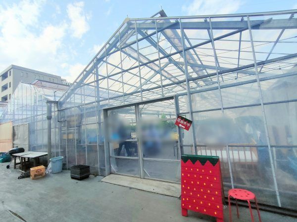 いちごの幟と可愛らしい看板が目印に。奥行き広がるビニールハウスが3棟建っています。ハウスの横には自転車置き場、車は1台のみ停められるので事前にご確認を。近隣にはコインパーキングが多数あります。