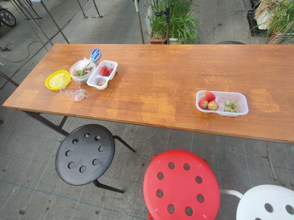 じゅわっと溢れる果汁に濃厚な甘みが滲み出た美味しいいちご、優しい香りの余韻に浸る前にまた、次々といちごを頬張ります。これを味わったら、スーパーの安いいちごには戻れないかも(スーパーさんごめんなさい)。どんどん進みます。 沢山摘んでから、休憩がてらテーブルでイスに座っていただけるのも嬉しいところ。