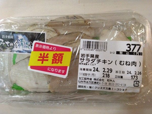 見つけましたぁ。キリタが大好きなサラダチキン。しかも半額。