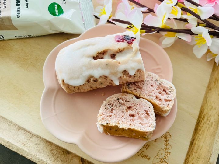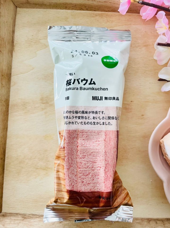 無印良品で、いつものスコーンやバウムクーヘンが売られている陳列棚に桜色のこちらの二つを見つけて、思わず手に取りました!
