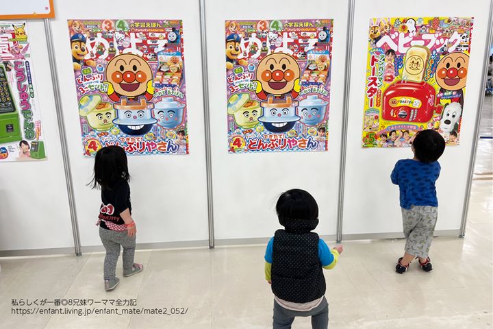最初に目についたのは"小学館"のコーナー。こちらでは知育雑誌の物販や実物の付録を見せていただきました。
