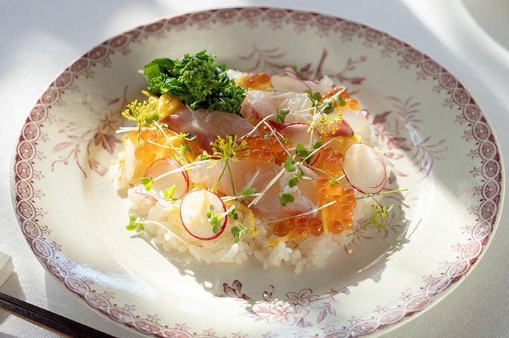 器に②の酢飯を広げ、③の錦糸卵を散らし、④の刺身を汁気とともにのせ、ラディッシュ、スプラウト、いくらを散らし、菜の花を添える。あればエディブルフラワーや咲いた菜の花を飾っても。