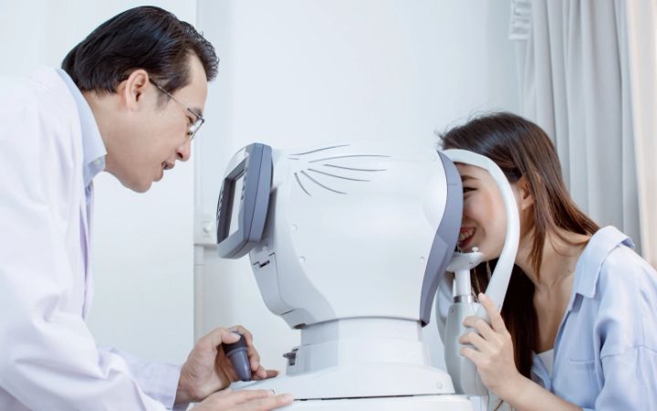 次に視力を測って、レンズの度数を決めます。このとき眼科からもらった処方箋を提出したり、使用中のメガネを持参して同じ度数で作ってもったりすることも可能です。
