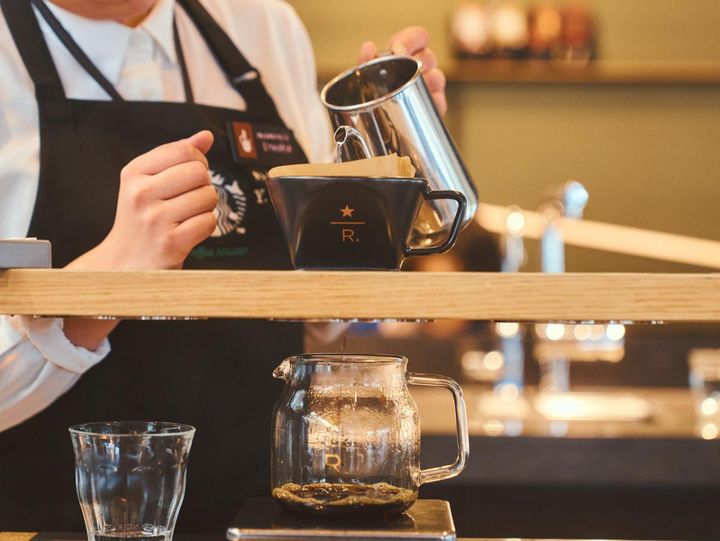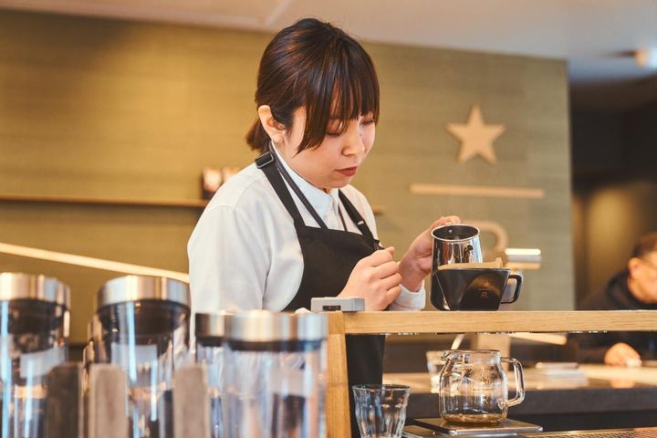 「スターバックス リザーブ®」を提供する店舗には、ブラックエプロンを身に着けたパートナーが多く在籍し、バリスタとしてコーヒーの魅力を教えてくれます。