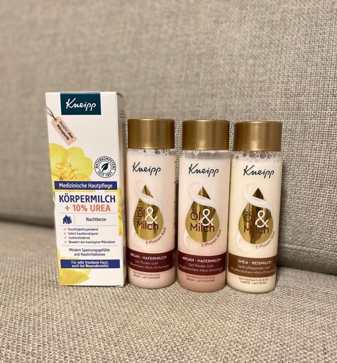 まずは尿素入りボディーミルク。乾燥肌や敏感肌の方にオススメで、傷口に塗ると肌の再生を促してくれる効果も期待できるそう。日本ではバスソルトが有名ですが、クナイプの作るクリームも品質が良質でぜひ使ってみていただきたい商品のひとつです。ボトルに入っている3つは、バスミルク。これまでクナイプの商品はよくチェックしていましたが、この商品は初めて見ました。アルガンオイルとシアバターを使用した入浴剤で、使用感はしっとりでお風呂上がりもつやつやな肌が保てます。