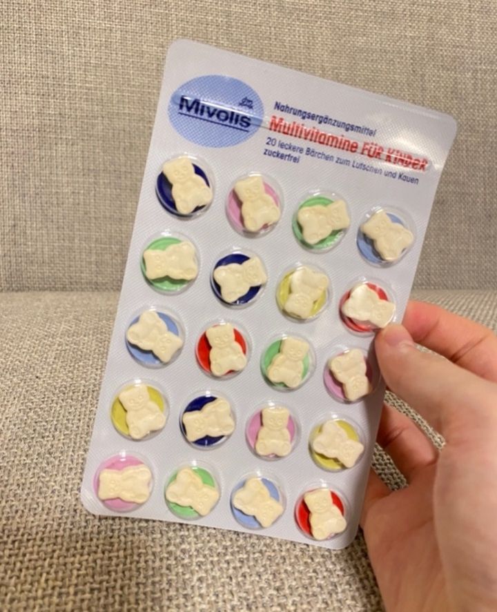 薬局に行くと、棚一列が全てサプリメントコーナーになっているほど健康意識が高いドイツでは、子ども用のビタミンタブレットや錠剤、シロップなど、さまざまな形で販売されています。見た目が可愛くて思わず手が伸びてしまうこの商品。体によし、見た目よし、安くてよし、いい所取りのタブレットもおすすめです。フルーティーなオレンジの味だそう。