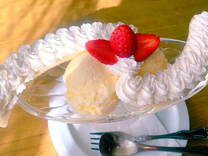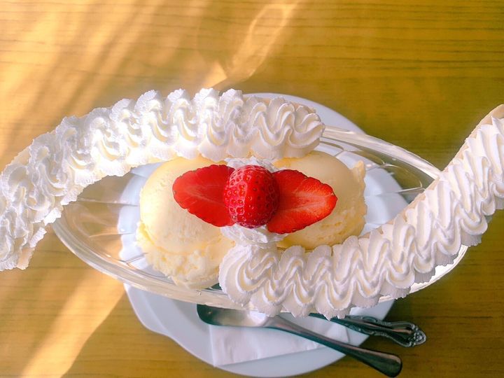 バナナの上にはたっぷりの生クリーム。そして、間には昔懐かしいお味のバニラアイスが2つ。