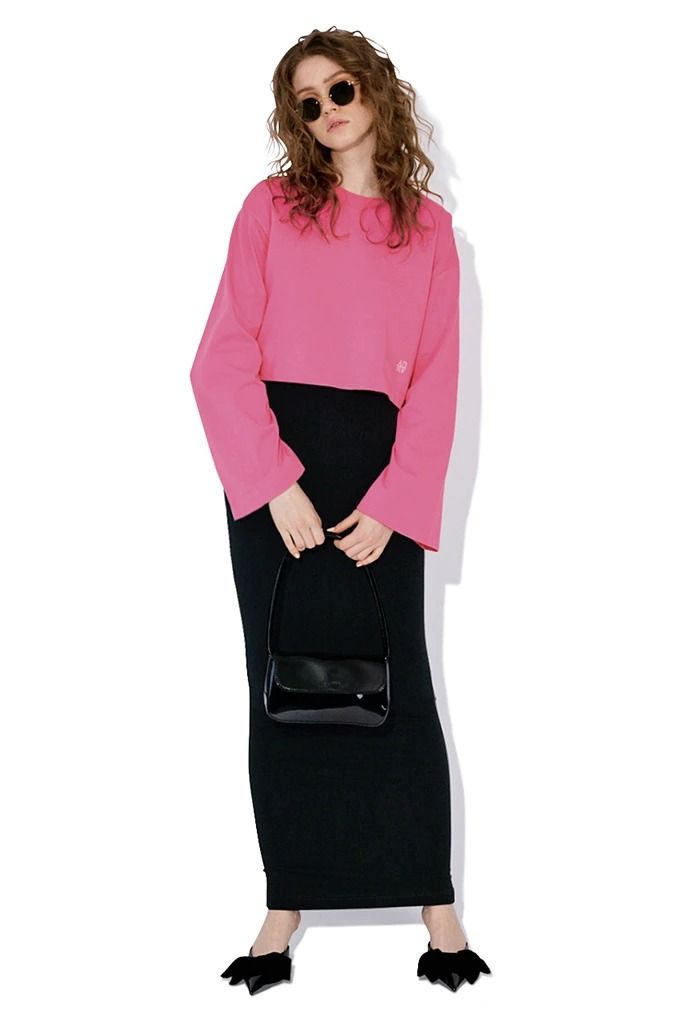 重ね着上手なショート丈のロンTで、映えるピンクの活躍幅を拡大。1点で目を引く色なだけに、Iラインの黒ワンピースで落ち着きを意識。