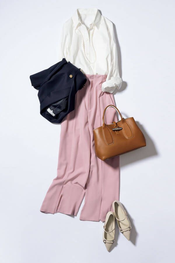 ピンクの甘さを端正なシャツ&ジャケットで落ち着かせて。お仕事場シーンでは派手要素は抑え、コンサバベースな装いで素敵な先輩感を演出♡