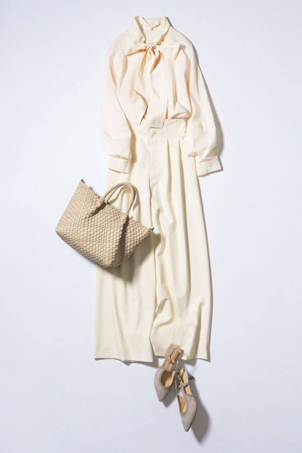 フェミニンなボウタイブラウスは同色系パンツで柔らかい印象に。洗練された雰囲気をまとえるオールホワイトはオフィスでも有効! ワイドパンツならこなれ見えを狙えます。