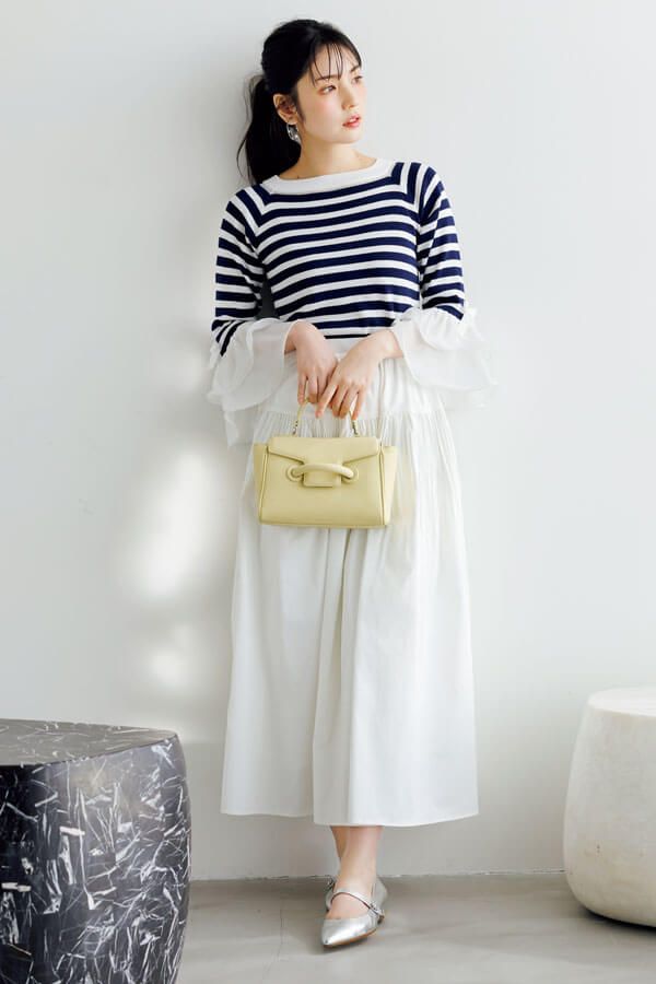 カジュアルになりがちなボーダー服も、プチリボンを添えたフリルスリーブのおかげでフェミニンコーデにもしっくり♡ 真っ白なフレアスカートを合わせればさわやかなマリンルックが完成!