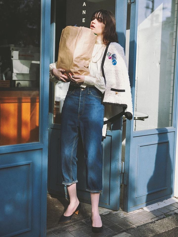 ブルーデニムパンツ 55,000円、白ツイードジャケット 212,300円、缶バッジ(5個入り) 4,180円/以上マディソンブルー ボウタイつき白ブラウス 49,500円/デパリエ(デパリエ 伊勢丹新宿店) パールネックレス 17,280円/アビステ 黒パンプス 42,900円/KATIM 薄手でやわらかく、夏にも快適にはける涼しいデニム。