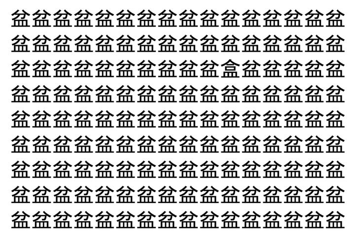 画像の中には、「盆」という漢字が縦に9行、横に16個並んでいます。 全部で144個となりますが・・・、そのうち1つは「異なる漢字」となってますよ!!