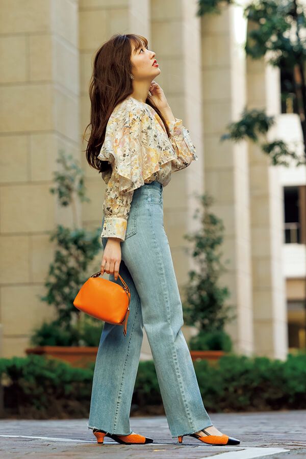 エレガントでありながらインパクトも十分なオレンジは、小物で取り入れるのがGOOD。 端正なフォルムのオレンジバッグ&ヒールで、女っぽデニムに都会的な高級感と華やぎをON。