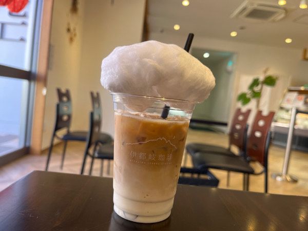 私が注文したのは、「天空カフェラテ」 宮島「伊都岐珈琲」を使用したカフェラテに、わたあめが乗っています。かわいい! わたあめがどうなるかはお話したいですが、秘密にしておきますね。