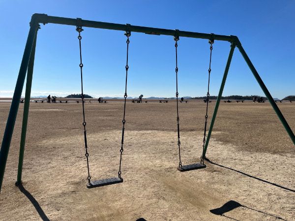 飛行機を眺めながらブランコで遊べるなんて夢のようです。その他にも、うんてい、ターザンロープのような遊具がありました。わんぱく砦と呼ばれる場所もあり、岩がたくさんある中で多くの子どもたちが楽しそうに遊んでいました。