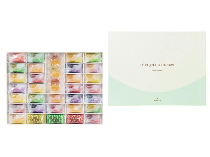 『彩果の宝石』は、厳選した果物のジューシーな果汁や果肉をゼリーにした商品。果物やお花をかたどった28種類のゼリーは、名前のごとく、まるで宝石のようです。
