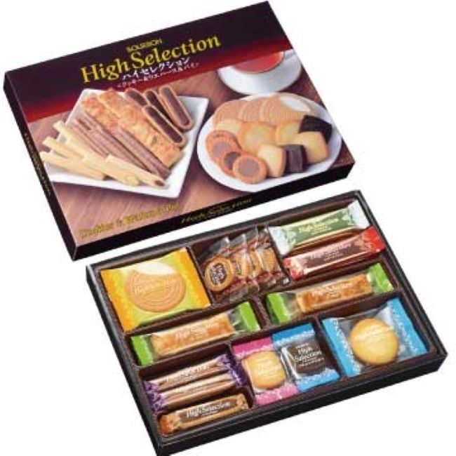 『BOURBON(ブルボン)』の「ハイセレクション」は、7種類のクッキー、3種類のウエハースとパイが詰め合わせになった、ギフト用セット商品。ブルボンの人気商品「エリーゼ」や「ルマンド」なども、ハイセレクションの個包装パッケージに包まれています。