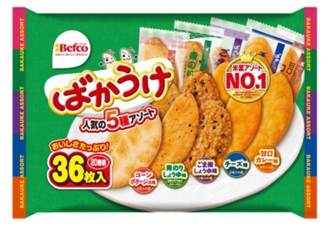『Befco(ベフコ)』の「ばかうけ」は、バリン!ボリン!と食べられる食感がクセになるおせんべい。大容量パックの「ばかうけアソート」は、青のり醤油味、ごま揚醤油味、チーズ味、甘口カレー味、コーンポタージュ味の5種類が個包装になって36枚入っています。