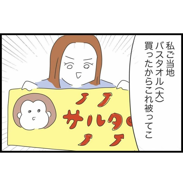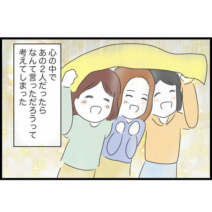 雨の中、同僚たちを置いて車をとりに一人で駐車場へ向かおうとするすみれさん。その姿に同僚たちは「一緒に行くよ」と買ったばかりのご当地バスタオルをかぶって付いてきてくれました。