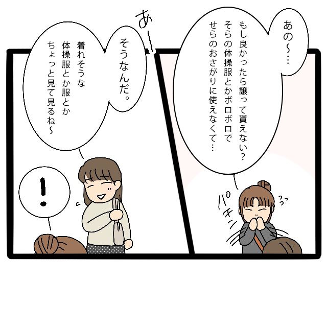 「もしよかったら譲ってもらえない?そらの体操服とかボロボロでせらのお下がりに使えなくて・・・」