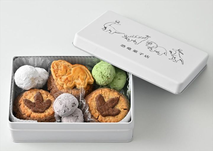恐竜サブレ缶(ティラノ) トロワサブレ(バニラ5枚)、ブールドネージュ(プレーン・ショコラ・抹茶 各2個づつ)、ティラノサブレ(1枚)
