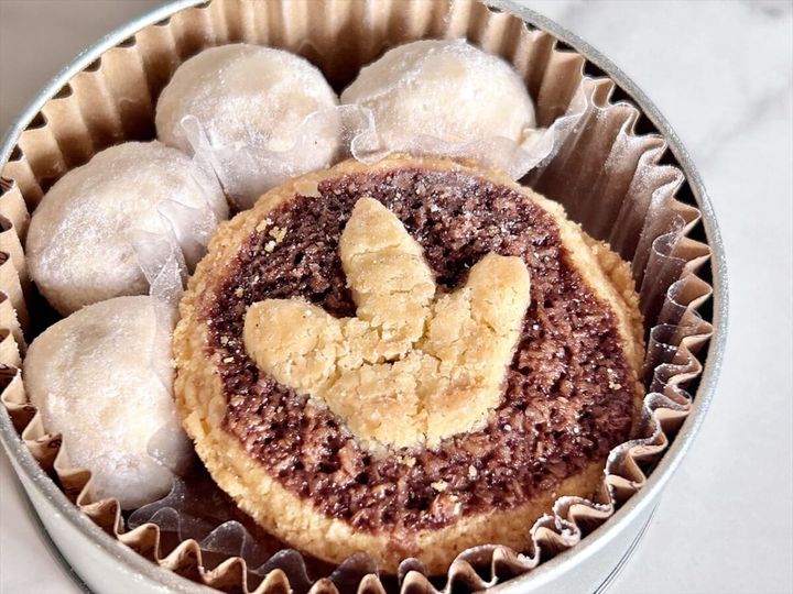永平寺トリケラ缶 トロワ・サブレ(バニラ)2枚、ブールドネージュ(抹茶)4個