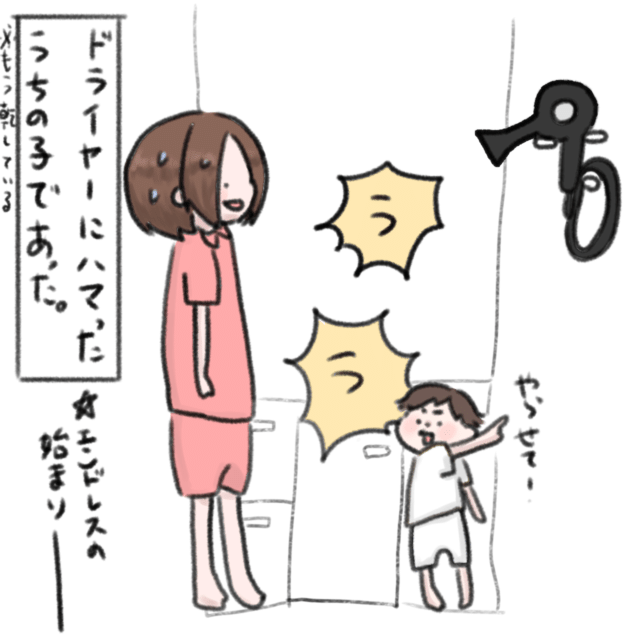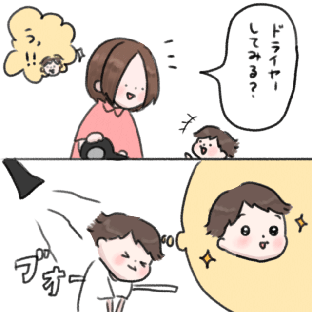 うっ!うっ!完全にハマったな・・ドライヤーに沼落ちした2歳息子の|ねむりひつじの子育て絵日記