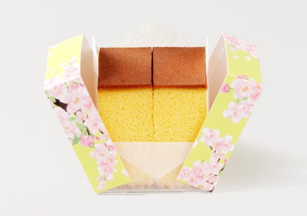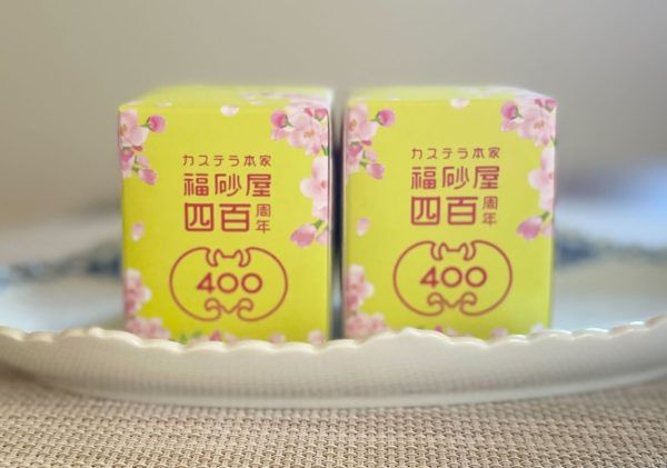 今年は、創業400周年を迎えた福砂屋の思いのひとつである「伝統を育てていく」というメッセージをこめて、新緑のみずみずしい若葉色と、毎年多くの人を楽しませてくれる目黒川沿いに咲くソメイヨシノを掛け合わせたデザインに。さらに400周年ロゴがあしらわれています。