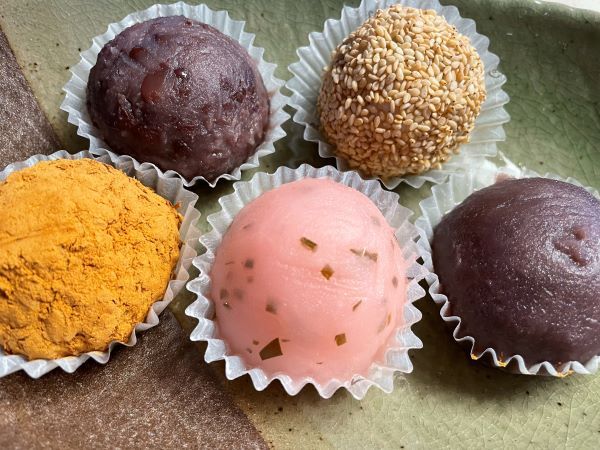おはぎは全部で5種類。 つぶあん、こしあん、きなこ、ごま、季節のおはぎ(取材時はさくらおはぎ)、各140円。