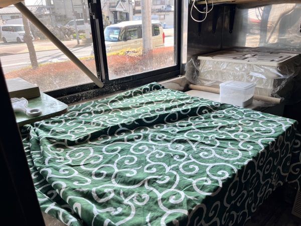手打ちうどんのお店で、店舗入口脇に手打ちスペースも有りました。この時は休憩中で布がかけられていましたが、タイミングが良ければ店舗入り口横の窓からもうどんを打っているところを見ることができるようになっていました。