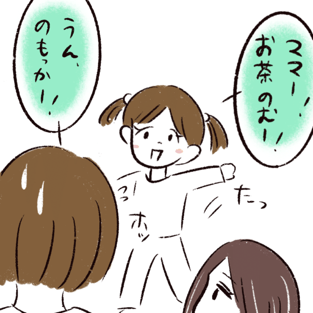 まるさんに遊んでもらうことは諦めたおーちゃん。でも、相手が変わっただけでまた別のママさんのところへ行くのですね。そして、また飲み物をねだる・・・(汗)