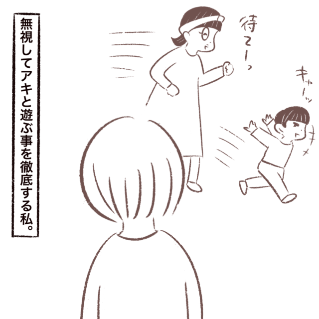 別の公園でもおーちゃんに会ってしまったまるさんは、放置子の対処法を思い出して無視を徹底。しかし、まるさんとアキくんが鬼ごっこを始めると、おーちゃんが勝手に鬼ごっこに参加してきてギョッ!「おーちゃんこっちだよー!」とアピールするおーちゃんを、胸が痛みつつもひたすら無視していたまるさん。すると・・・。