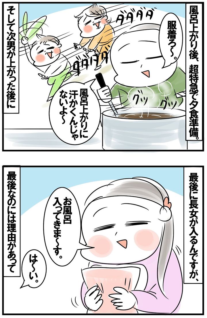 下2人が上がるのを見届けた後は、なかなか服を着ない末っ子に声をかけつつ急いで夕食の準備。