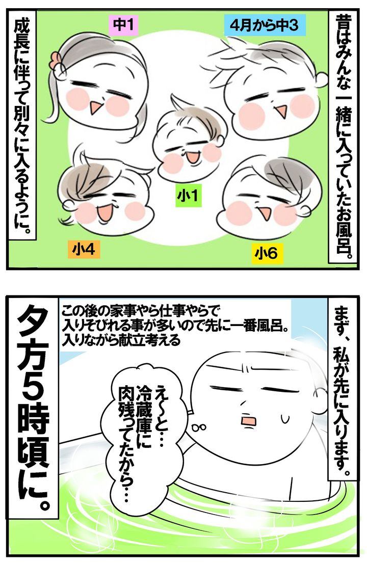 わが家は昔から先風呂派なので夕ごはん前にお風呂に入るのですが、夕方以降、鬼忙しくなるので入りそびれぬようにまず私がひとりでササっと入ります。