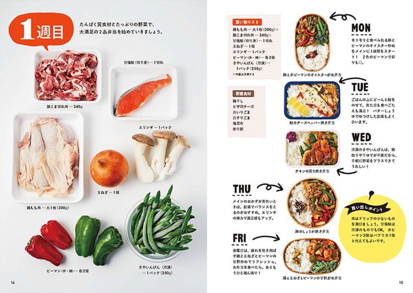 お弁当6週分30パターンを紹介。1週間分の買い物リストも掲載、材料を無駄なく使いきることができます。さらに、効率よく作る段取りヒント付き。ゆでる、筋をとるなどの下ごしらえが不要な冷凍野菜を活用するアイデアもいっぱいなのもうれしいポイント。
